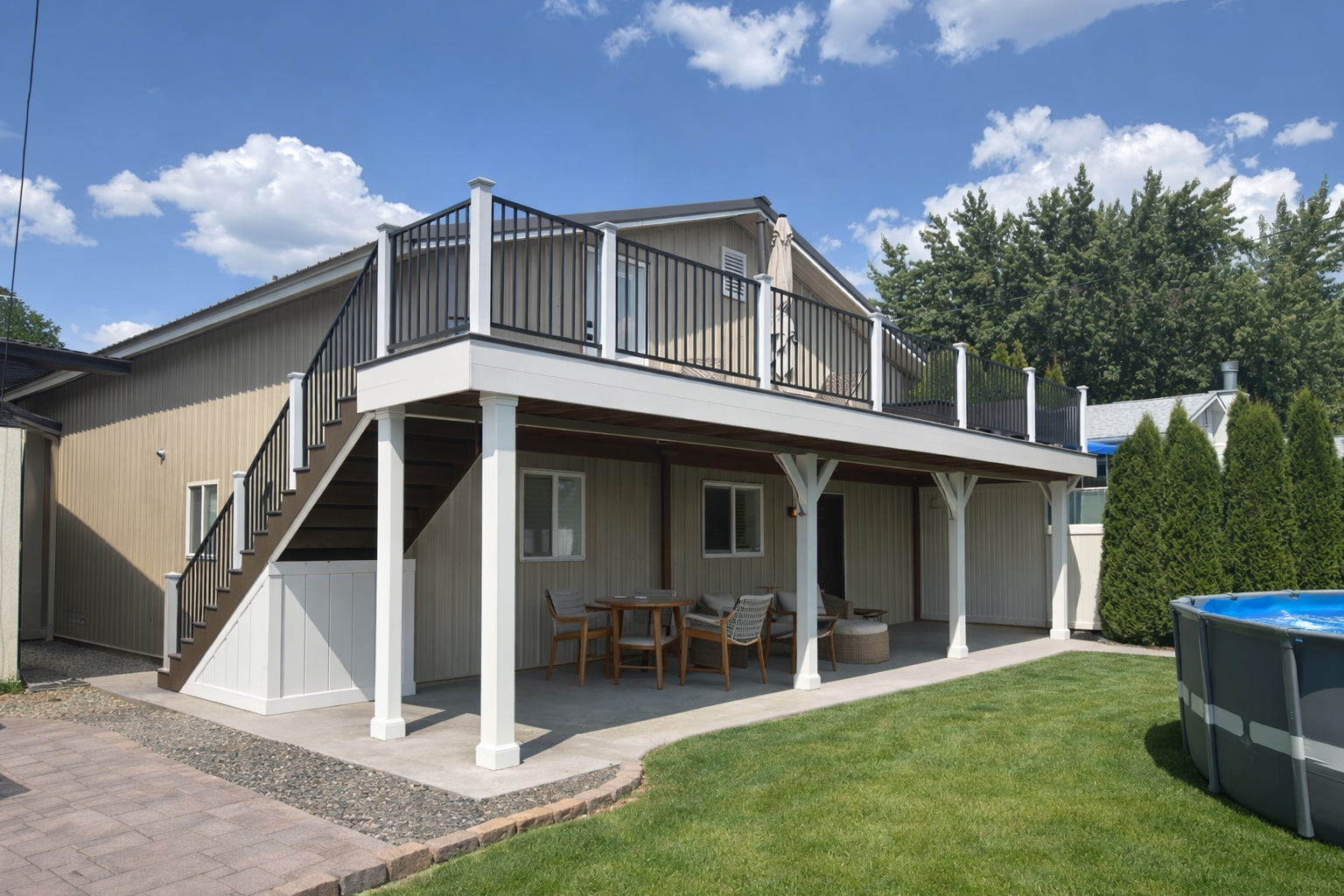 Stunning two-story elevated deck with covered patio space below. Features white columns, dark aluminum railings, and a spacious upper deck with integrated staircase for seamless outdoor living.
