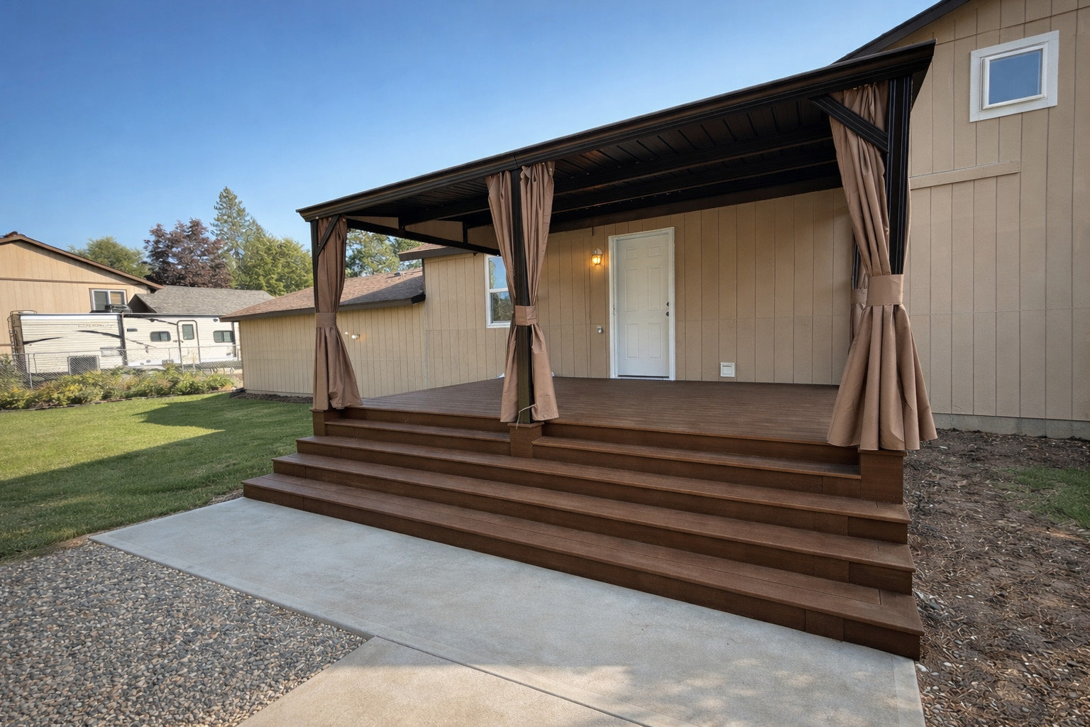 Elegant covered porch featuring rich brown composite decking with a custom pergola roof structure and decorative curtains. Includes wide stairs and clean fascia detailing.