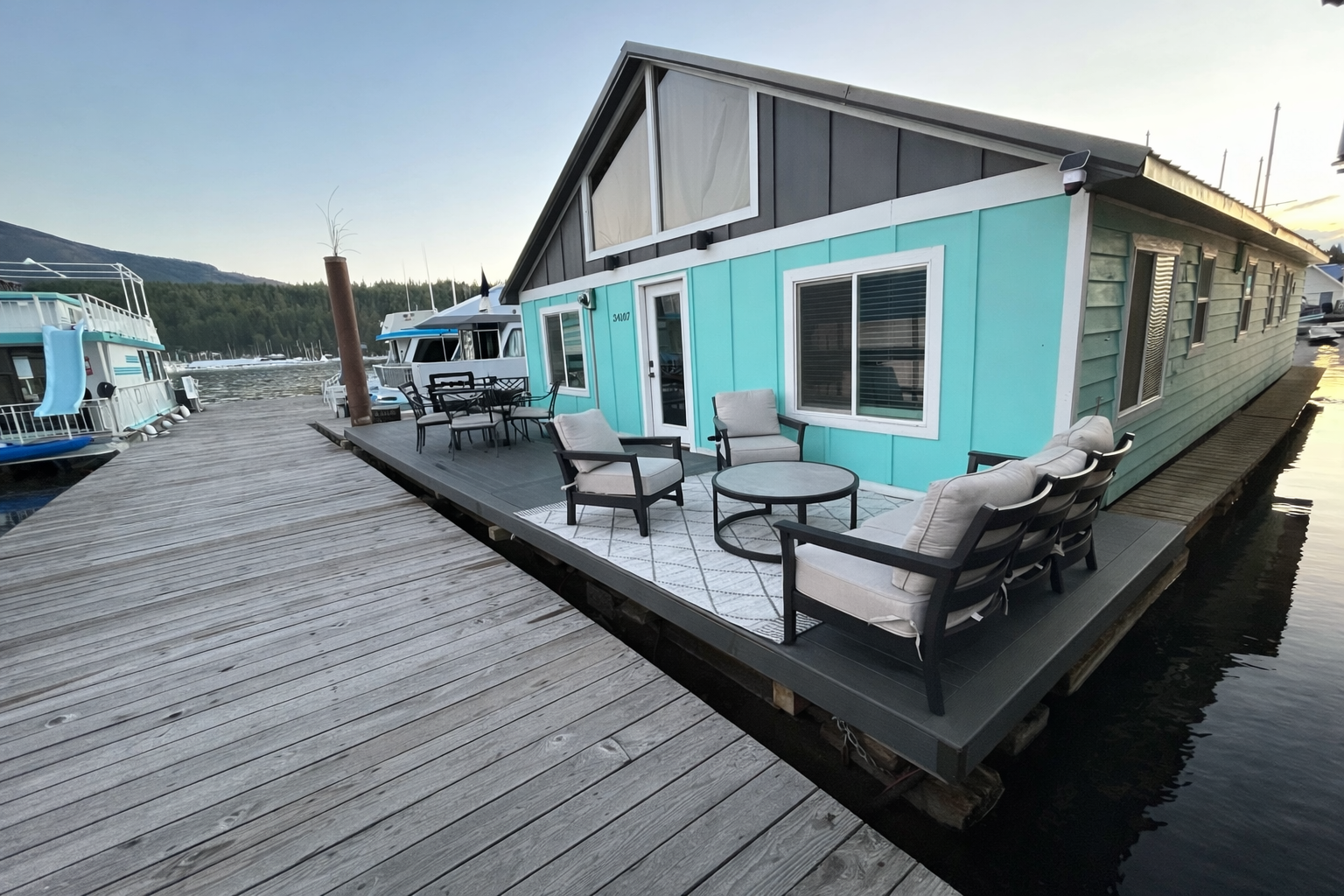 Unique waterfront dock decking for a houseboat on Lake Pend Oreille. Custom-built to withstand marina conditions while providing a beautiful outdoor entertaining space with stunning lake views.